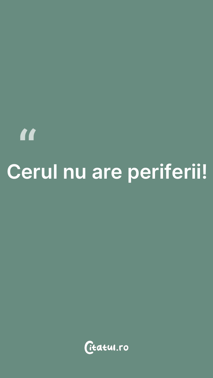 Cerul nu are periferii! ... Categorie: citate spiritualitate Dificultate: Foarte ușor de citit! Votează: ★ ★ ★ ★ ★ (0/5 din 0) Distribuiți acest citat? Alegeți platforma preferată: Salvează citatul in telefon/pc Cerul nu are periferii! Copiază Favorite Eroare