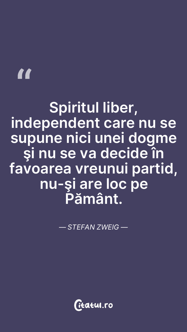 Spiritul liber, independent care nu se supune nici unei dogme şi nu se va decide în favoarea vreunui partid, nu-şi are loc pe Pământ. Stefan Zweig