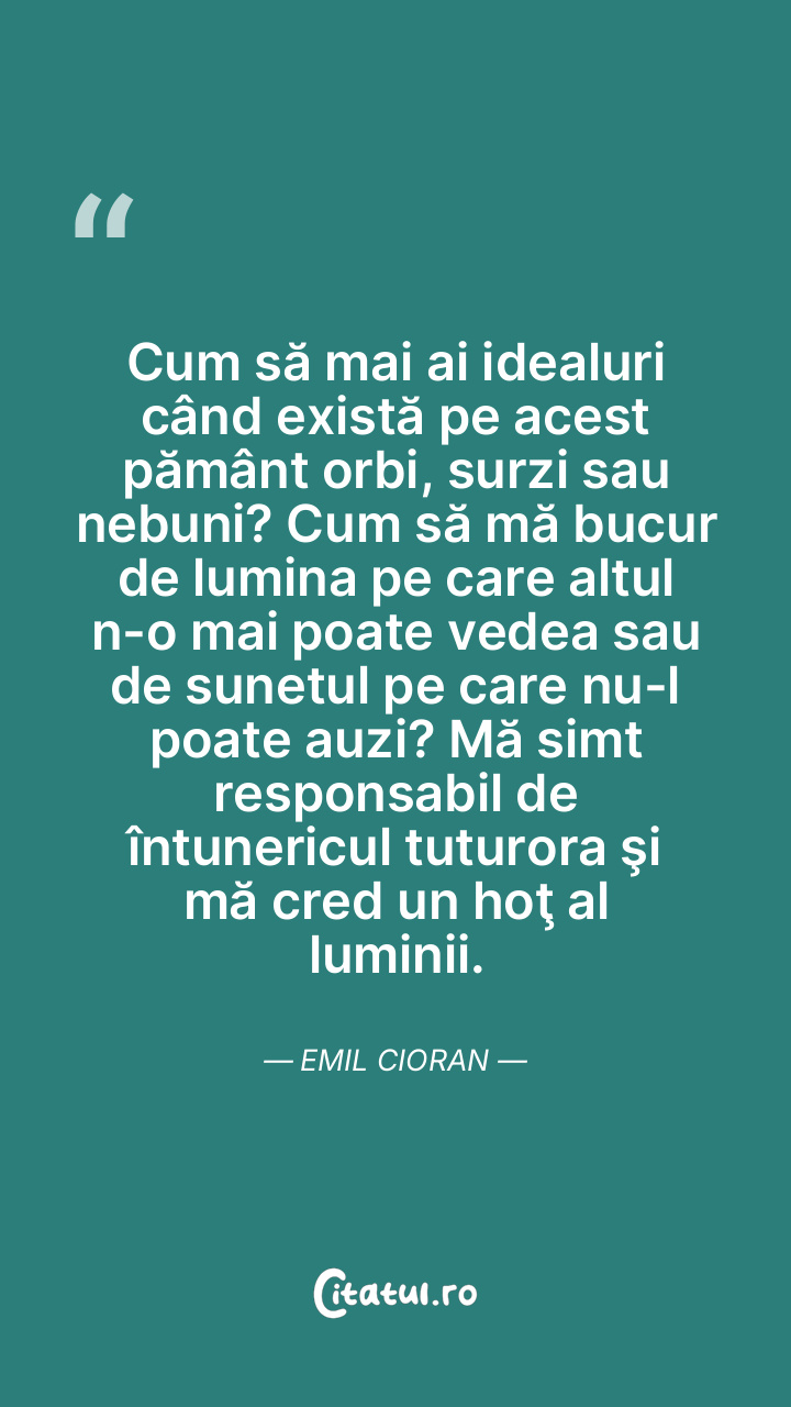 Cum să mai ai idealuri când există pe acest pământ orbi, surzi sau nebuni? Cum să mă bucur de lumina pe care altul n-o mai poate vedea sau de sunetul pe care nu-l poate auzi? Mă simt responsabil de întunericul tuturora şi mă cred un hoţ al luminii. Emil Cioran