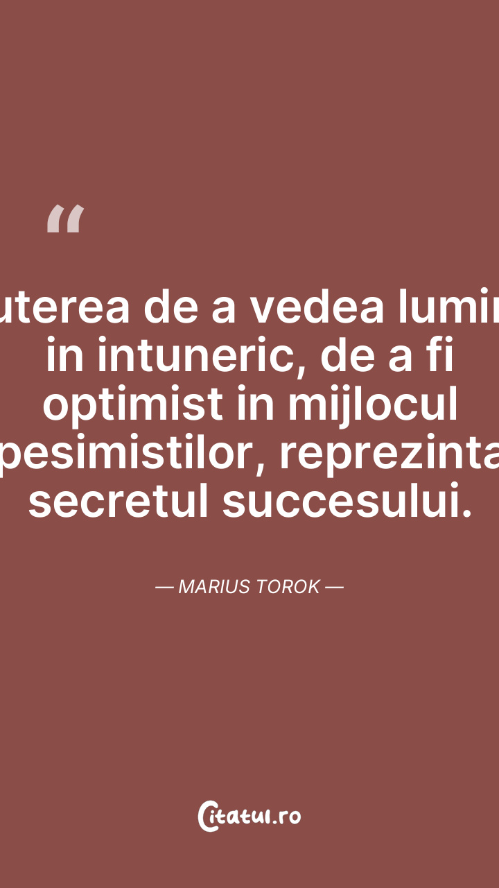 Puterea de a vedea lumina in intuneric, de a fi optimist in mijlocul pesimistilor, reprezinta secretul succesului. Marius Torok
