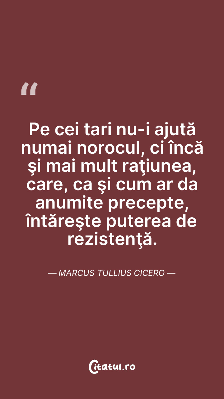 Pe cei tari nu-i ajută numai norocul, ci încă şi mai mult raţiunea, care, ca şi cum ar da anumite precepte, întăreşte puterea de rezistenţă. Marcus Tullius Cicero