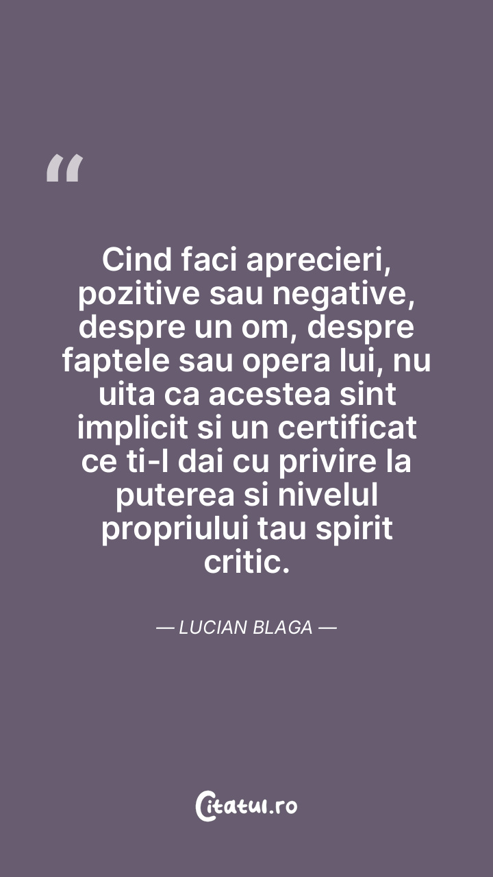 Cind faci aprecieri, pozitive sau negative, despre un om, despre faptele sau opera lui, nu uita ca acestea sint implicit si un certificat ce ti-l dai cu privire la puterea si nivelul propriului tau spirit critic. Lucian Blaga