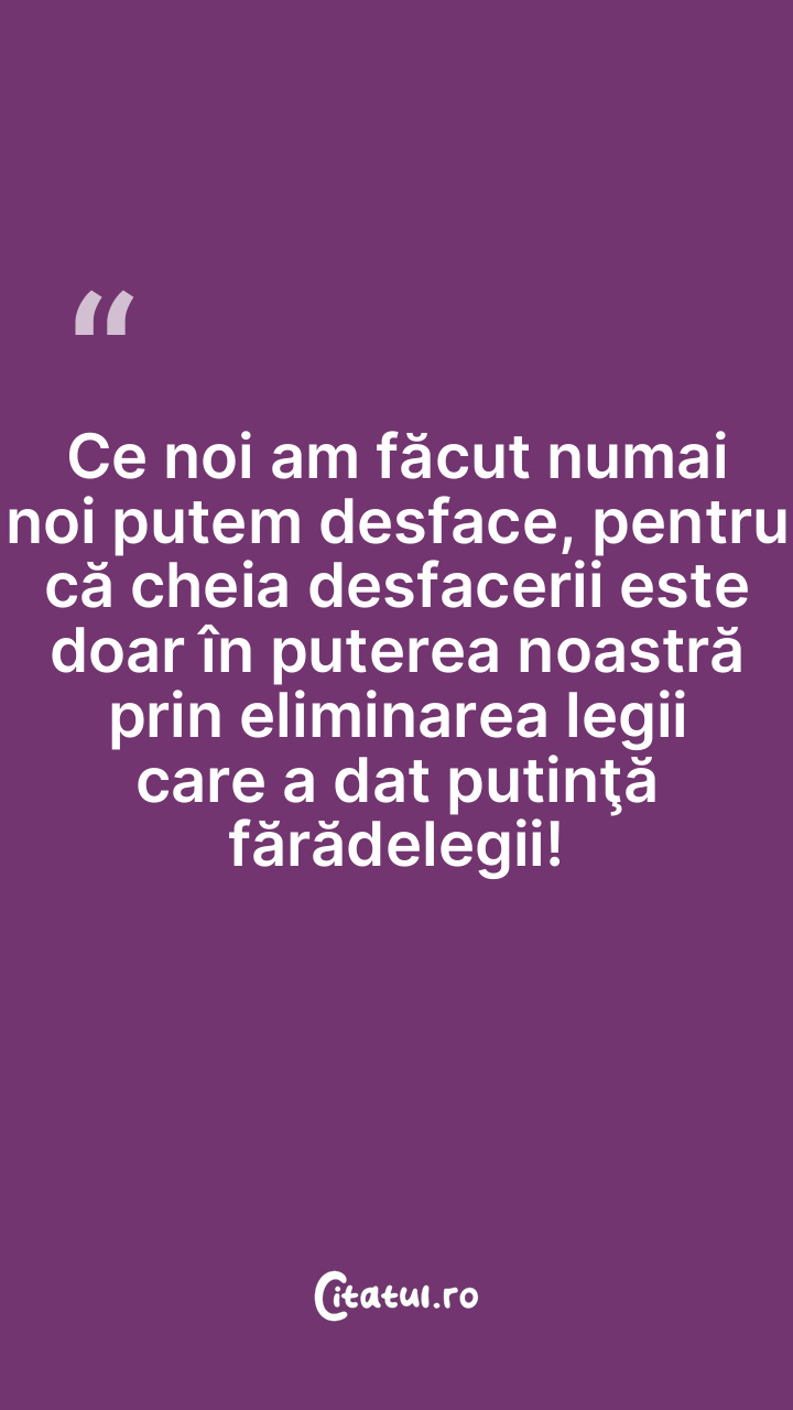 Ce noi am făcut numai noi putem desface, pentru că cheia desfacerii este doar în puterea noastră prin eliminarea legii care a dat putinţă fărădelegii!