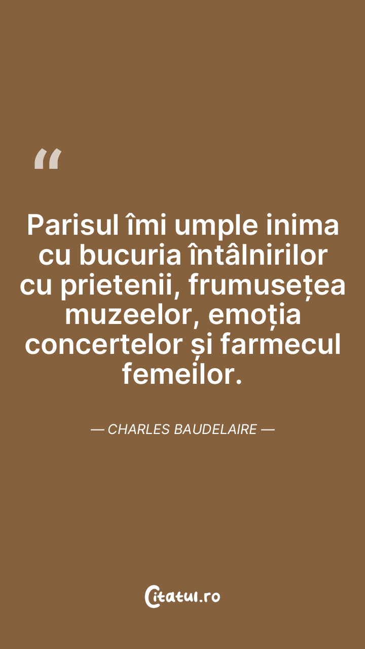 Parisul îmi umple inima cu bucuria întâlnirilor cu prietenii, frumusețea muzeelor, emoția concertelor și farmecul femeilor. Charles Baudelaire