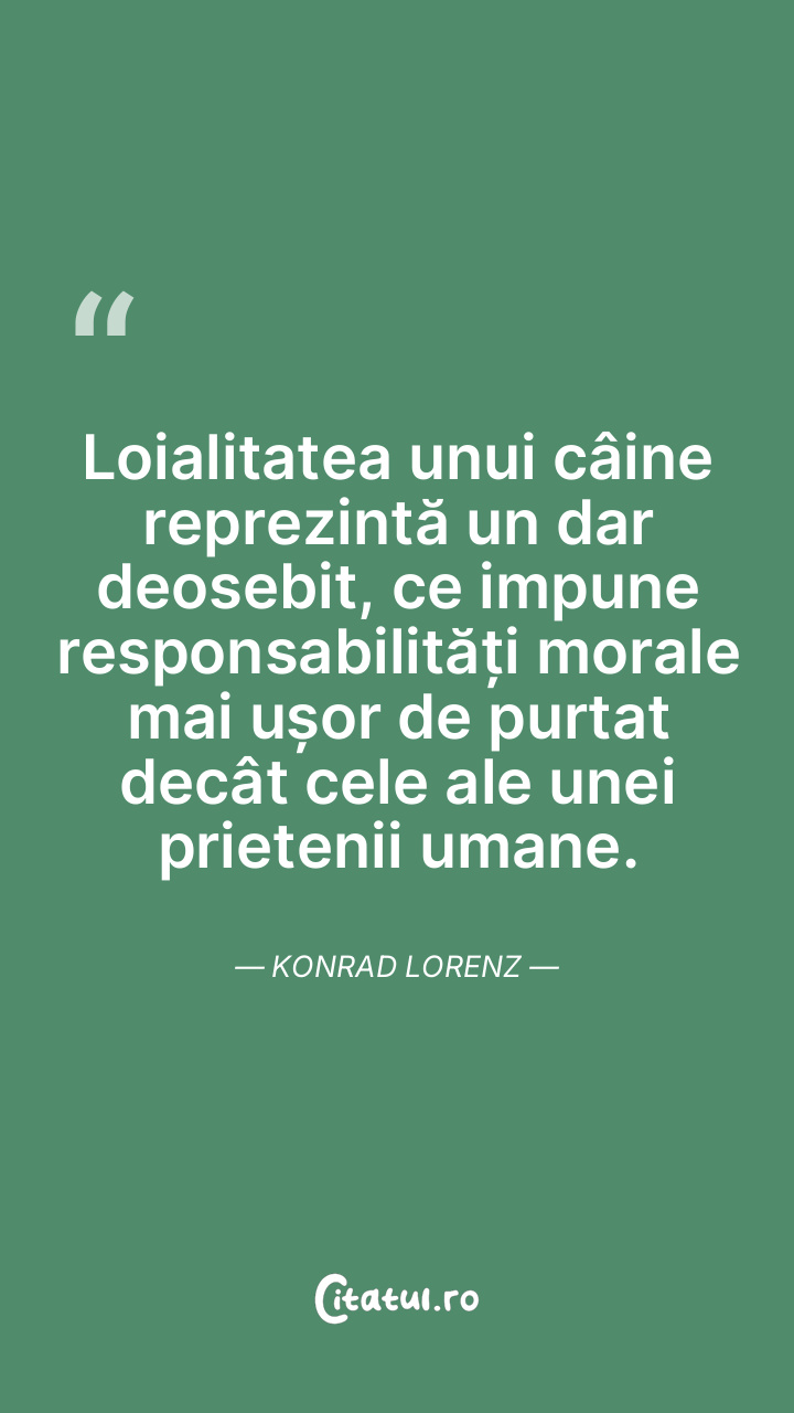 Loialitatea unui câine reprezintă un dar deosebit, ce impune responsabilități morale mai ușor de purtat decât cele ale unei prietenii umane. Konrad Lorenz