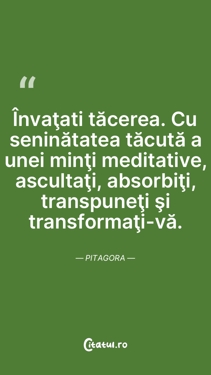 Învaţati tăcerea. Cu seninătatea tăcută a unei minţi meditative, ascultaţi, absorbiţi, transpuneţi şi transformaţi-vă. Pitagora