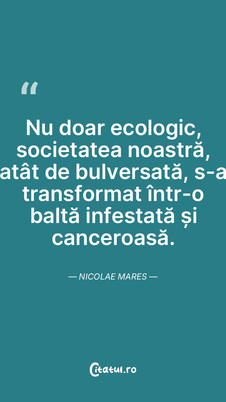 Nu doar ecologic, societatea noastră, atât de bulversată, s-a transformat într-o baltă infestată și canceroasă. Nicolae Mares