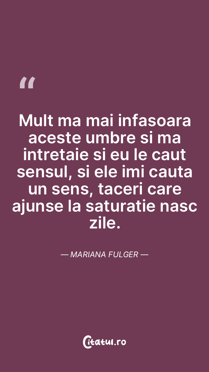 Mult ma mai infasoara aceste umbre si ma intretaie si eu le caut sensul, si ele imi cauta un sens, taceri care ajunse la saturatie nasc zile. Mariana Fulger