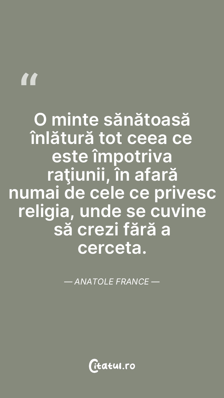 O minte sănătoasă înlătură tot ceea ce este împotriva raţiunii, în afară numai de cele ce privesc religia, unde se cuvine să crezi fără a cerceta. Anatole France
