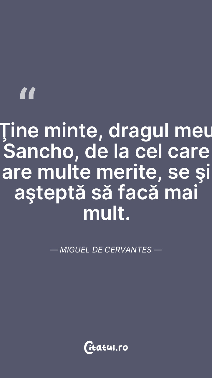 Ţine minte, dragul meu Sancho, de la cel care are multe merite, se şi aşteptă să facă mai mult. Miguel de Cervantes