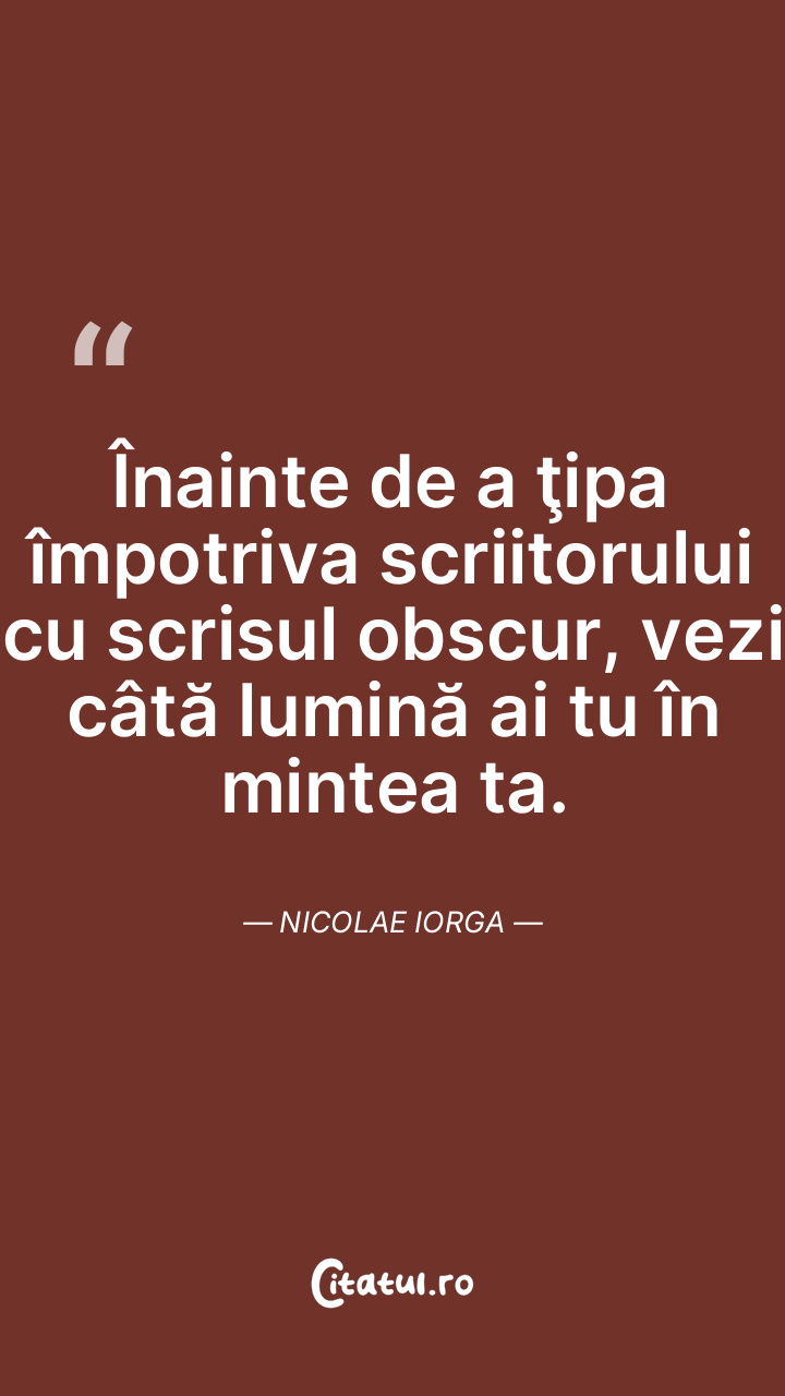 Înainte de a ţipa împotriva scriitorului cu scrisul obscur, vezi câtă lumină ai tu în mintea ta. Nicolae Iorga