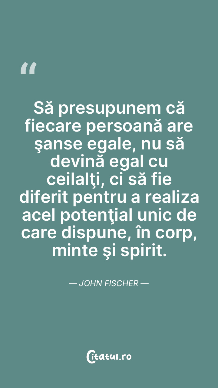 Să presupunem că fiecare persoană are şanse egale, nu să devină egal cu ceilalţi, ci să fie diferit pentru a realiza acel potenţial unic de care dispune, în corp, minte şi spirit. John Fischer