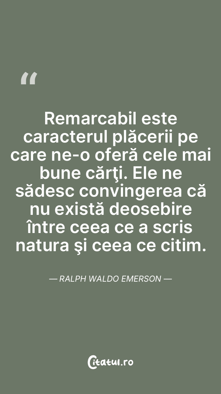 Remarcabil este caracterul plăcerii pe care ne-o oferă cele mai bune cărţi. Ele ne sădesc convingerea că nu există deosebire între ceea ce a scris natura şi ceea ce citim. Ralph Waldo Emerson