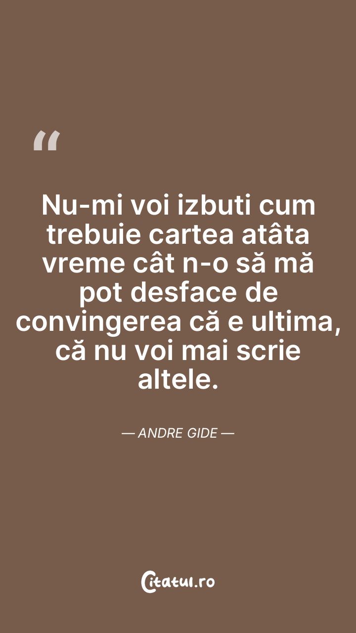 Nu-mi voi izbuti cum trebuie cartea atâta vreme cât n-o să mă pot desface de convingerea că e ultima, că nu voi mai scrie altele. Andre Gide