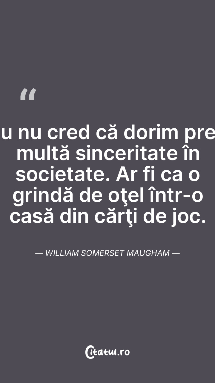 Eu nu cred că dorim prea multă sinceritate în societate. Ar fi ca o grindă de oţel într-o casă din cărţi de joc. William Somerset Maugham