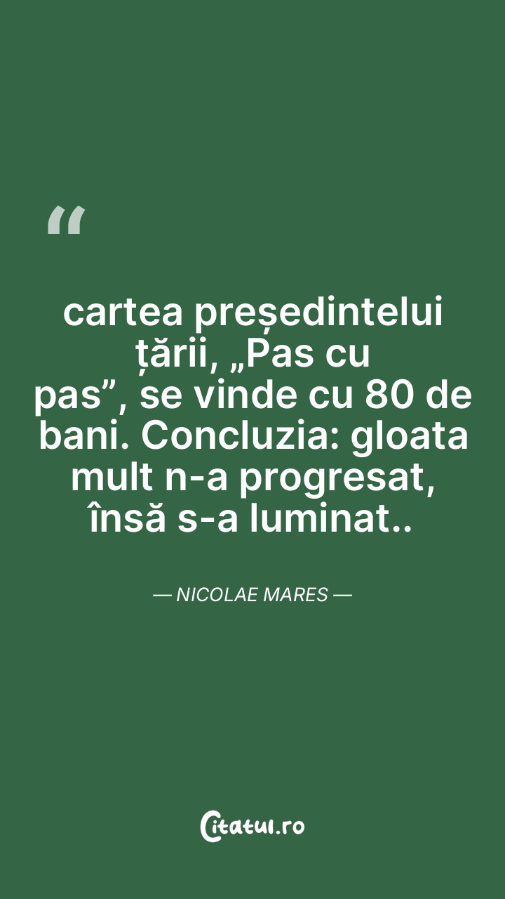 cartea președintelui țării, „Pas cu pas”, se vinde cu 80 de bani. Concluzia: gloata mult n-a progresat, însă s-a luminat.. Nicolae Mares