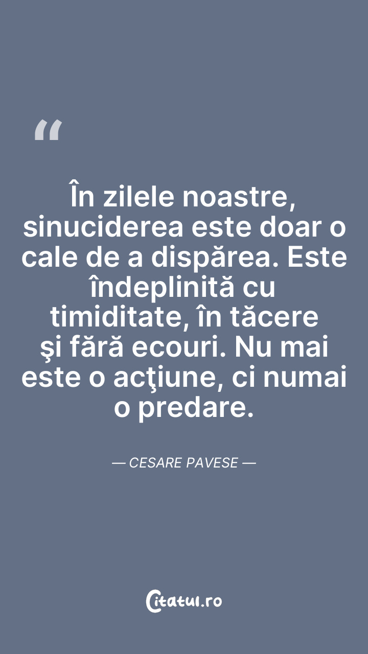 În zilele noastre, sinuciderea este doar o cale de a dispărea. Este îndeplinită cu timiditate, în tăcere şi fără ecouri. Nu mai este o acţiune, ci numai o predare. Cesare Pavese