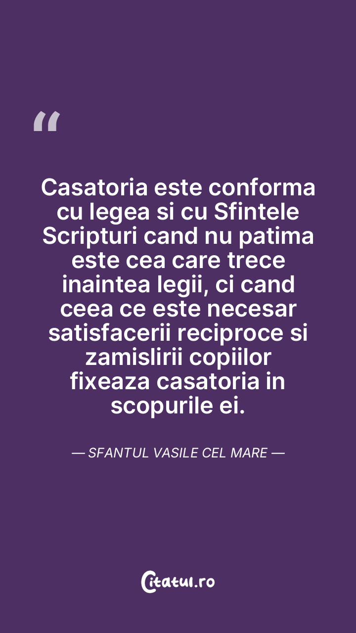Casatoria este conforma cu legea si cu Sfintele Scripturi cand nu patima este cea care trece inaintea legii, ci cand ceea ce este necesar satisfacerii reciproce si zamislirii copiilor fixeaza casatoria in scopurile ei. Sfantul Vasile cel Mare