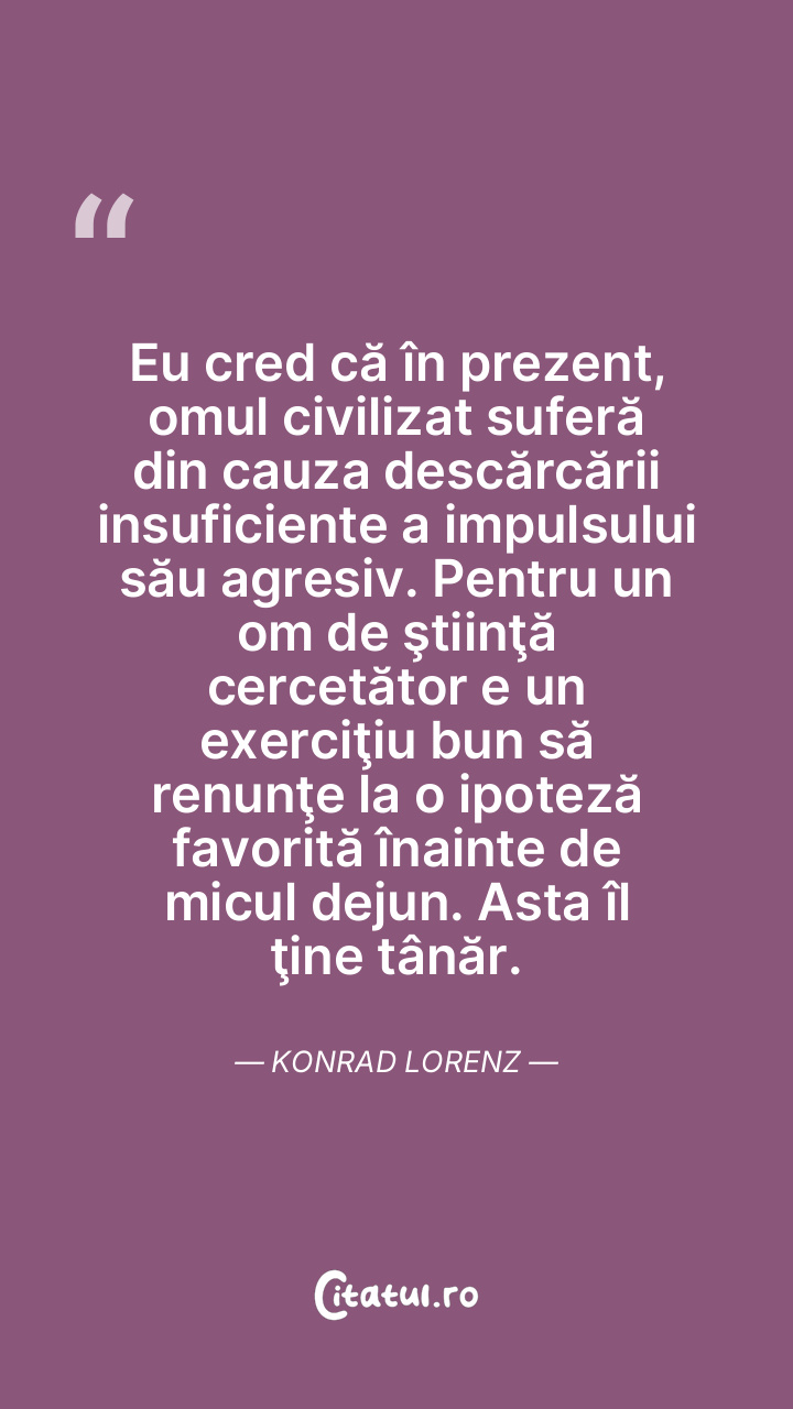 Eu cred că în prezent, omul civilizat suferă din cauza descărcării insuficiente a impulsului său agresiv. Pentru un om de ştiinţă cercetător e un exerciţiu bun să renunţe la o ipoteză favorită înainte de micul dejun. Asta îl ţine tânăr. Konrad Lorenz