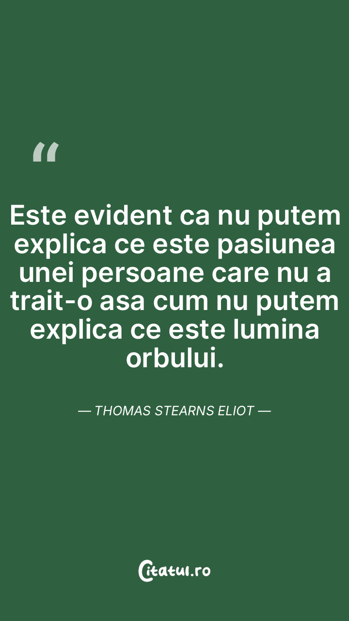 Este evident ca nu putem explica ce este pasiunea unei persoane care nu a trait-o asa cum nu putem explica ce este lumina orbului. Thomas Stearns Eliot