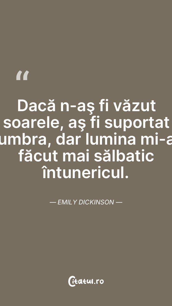 Dacă n-aş fi văzut soarele, aş fi suportat umbra, dar lumina mi-a făcut mai sălbatic întunericul. Emily Dickinson