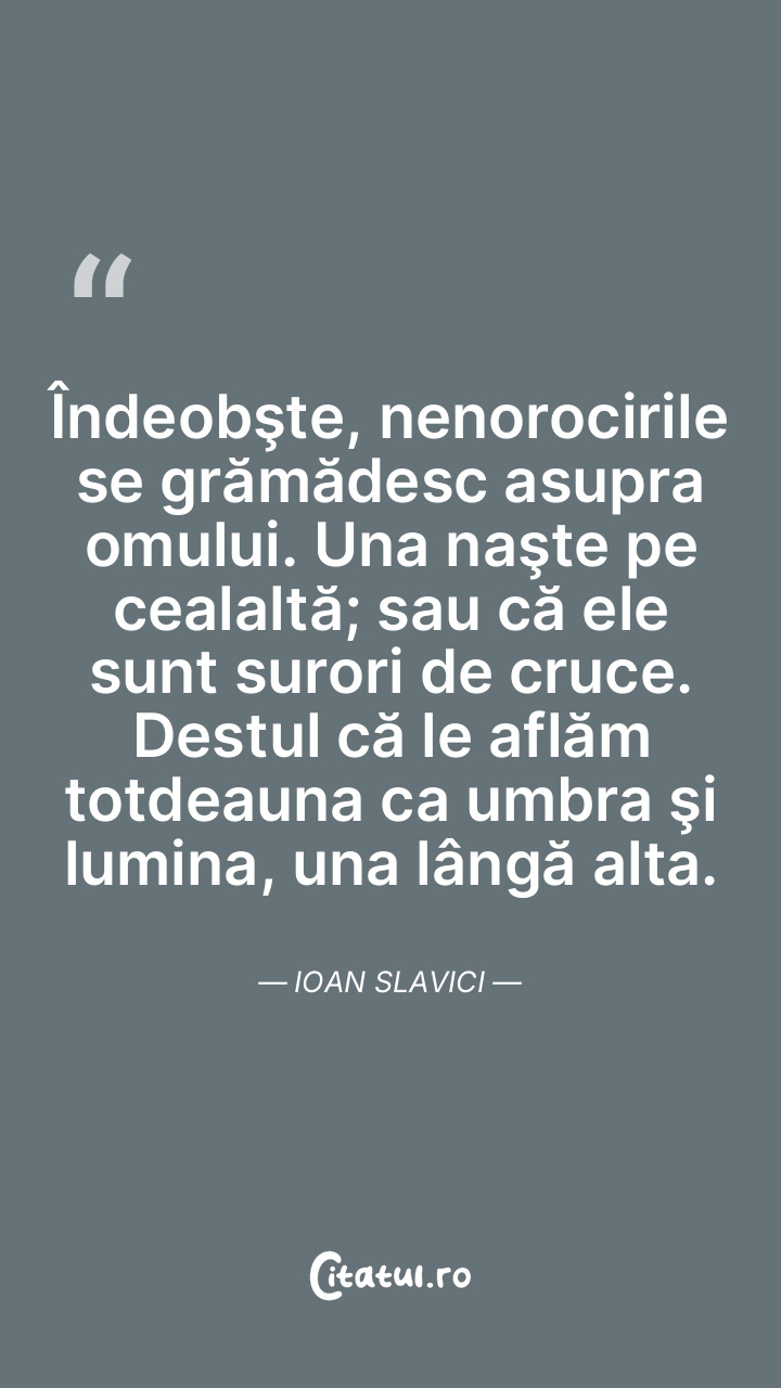 Îndeobşte, nenorocirile se grămădesc asupra omului. Una naşte pe cealaltă; sau că ele sunt surori de cruce. Destul că le aflăm totdeauna ca umbra şi lumina, una lângă alta. Ioan Slavici