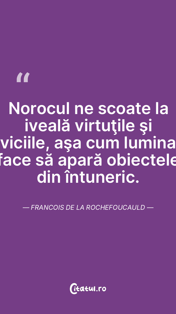 Norocul ne scoate la iveală virtuţile şi viciile, aşa cum lumina face să apară obiectele din întuneric. Francois de la Rochefoucauld