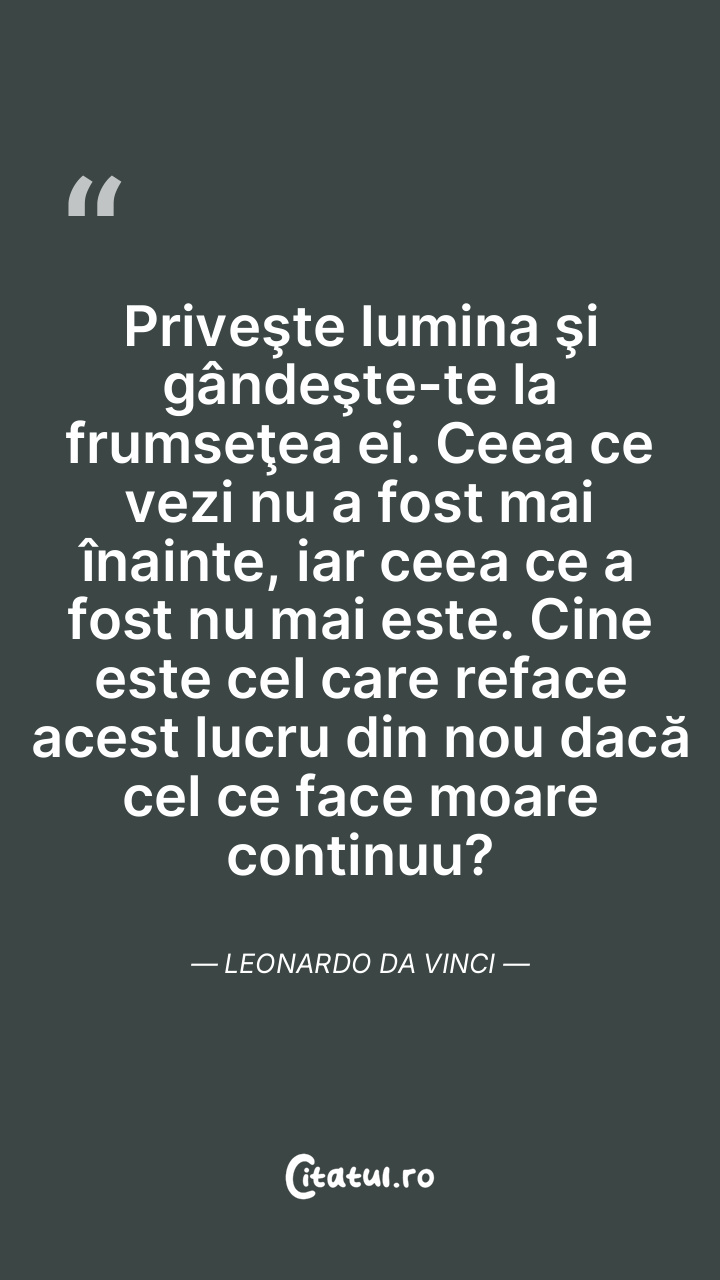 Priveşte lumina şi gândeşte-te la frumseţea ei. Ceea ce vezi nu a fost mai înainte, iar ceea ce a fost nu mai este. Cine este cel care reface acest lucru din nou dacă cel ce face moare continuu? Leonardo da Vinci