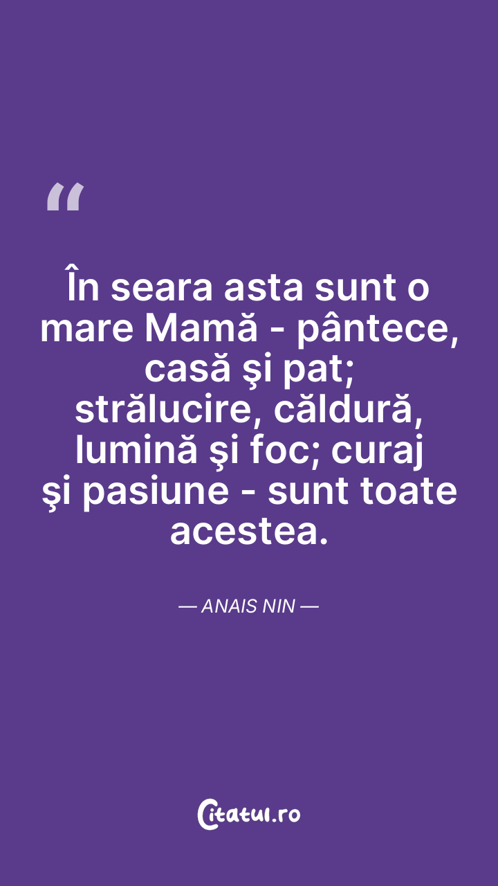 În seara asta sunt o mare Mamă - pântece, casă şi pat; strălucire, căldură, lumină şi foc; curaj şi pasiune - sunt toate acestea. Anais Nin