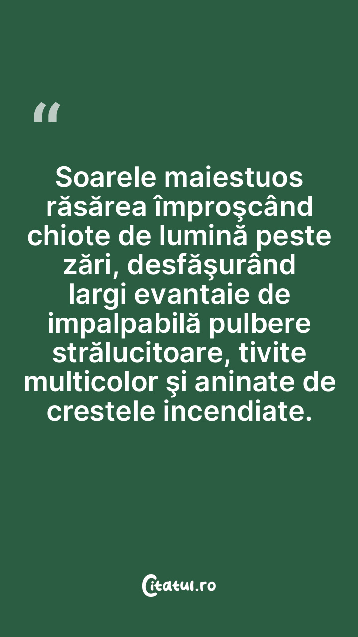 Soarele maiestuos răsărea împroşcând chiote de lumină peste zări, desfăşurând largi evantaie de impalpabilă pulbere strălucitoare, tivite multicolor şi aninate de crestele incendiate.
