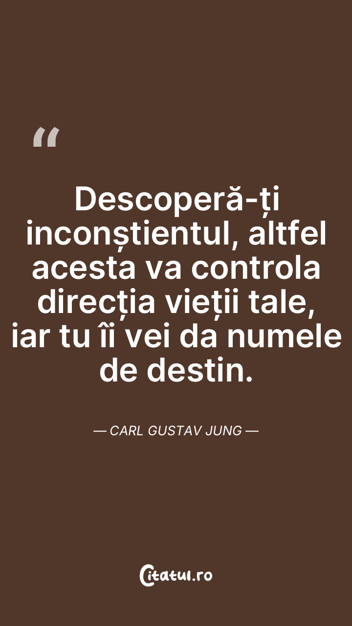 Descoperă-ți inconștientul, altfel acesta va controla direcția vieții tale, iar tu îi vei da numele de destin. Carl Gustav Jung