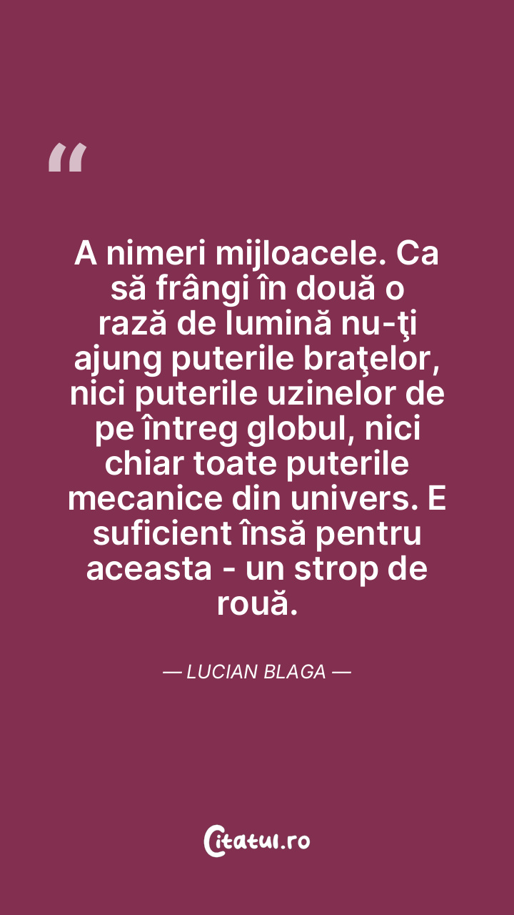A nimeri mijloacele. Ca să frângi în două o rază de lumină nu-ţi ajung puterile braţelor, nici puterile uzinelor de pe întreg globul, nici chiar toate puterile mecanice din univers. E suficient însă pentru aceasta - un strop de rouă. Lucian Blaga