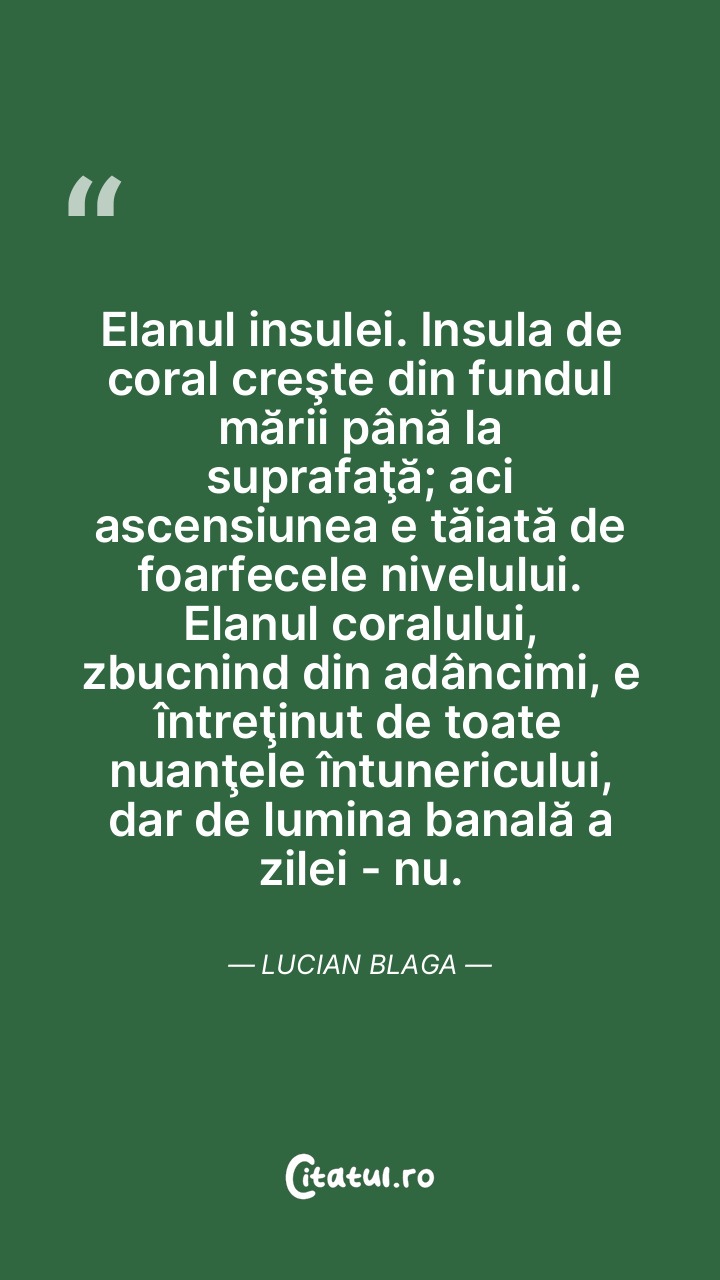 Elanul insulei. Insula de coral creşte din fundul mării până la suprafaţă; aci ascensiunea e tăiată de foarfecele nivelului. Elanul coralului, zbucnind din adâncimi, e întreţinut de toate nuanţele întunericului, dar de lumina banală a zilei - nu. Lucian Blaga