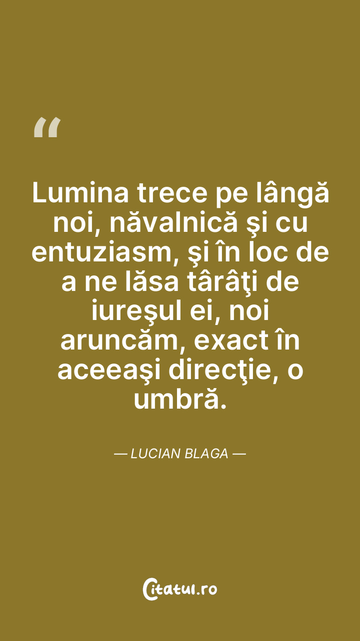Lumina trece pe lângă noi, năvalnică şi cu entuziasm, şi în loc de a ne lăsa târâţi de iureşul ei, noi aruncăm, exact în aceeaşi direcţie, o umbră. Lucian Blaga