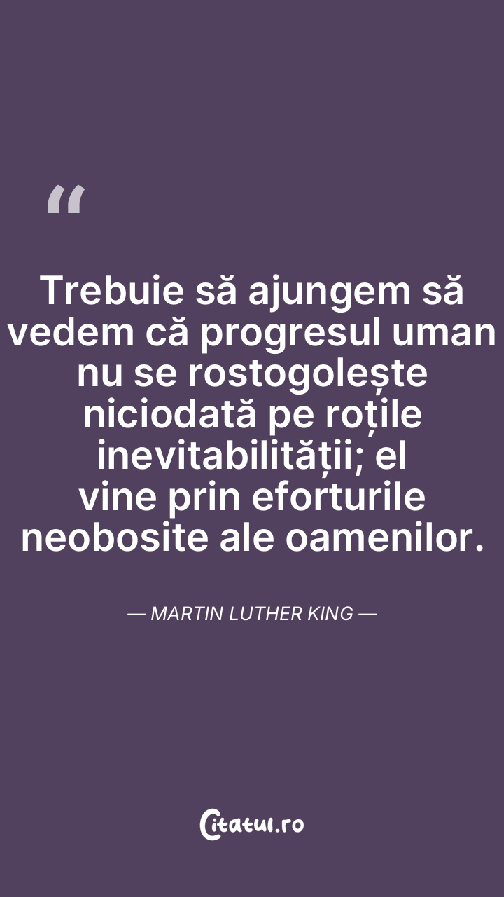 Trebuie să ajungem să vedem că progresul uman nu se rostogolește niciodată pe roțile inevitabilității; el vine prin eforturile neobosite ale oamenilor. Martin Luther King