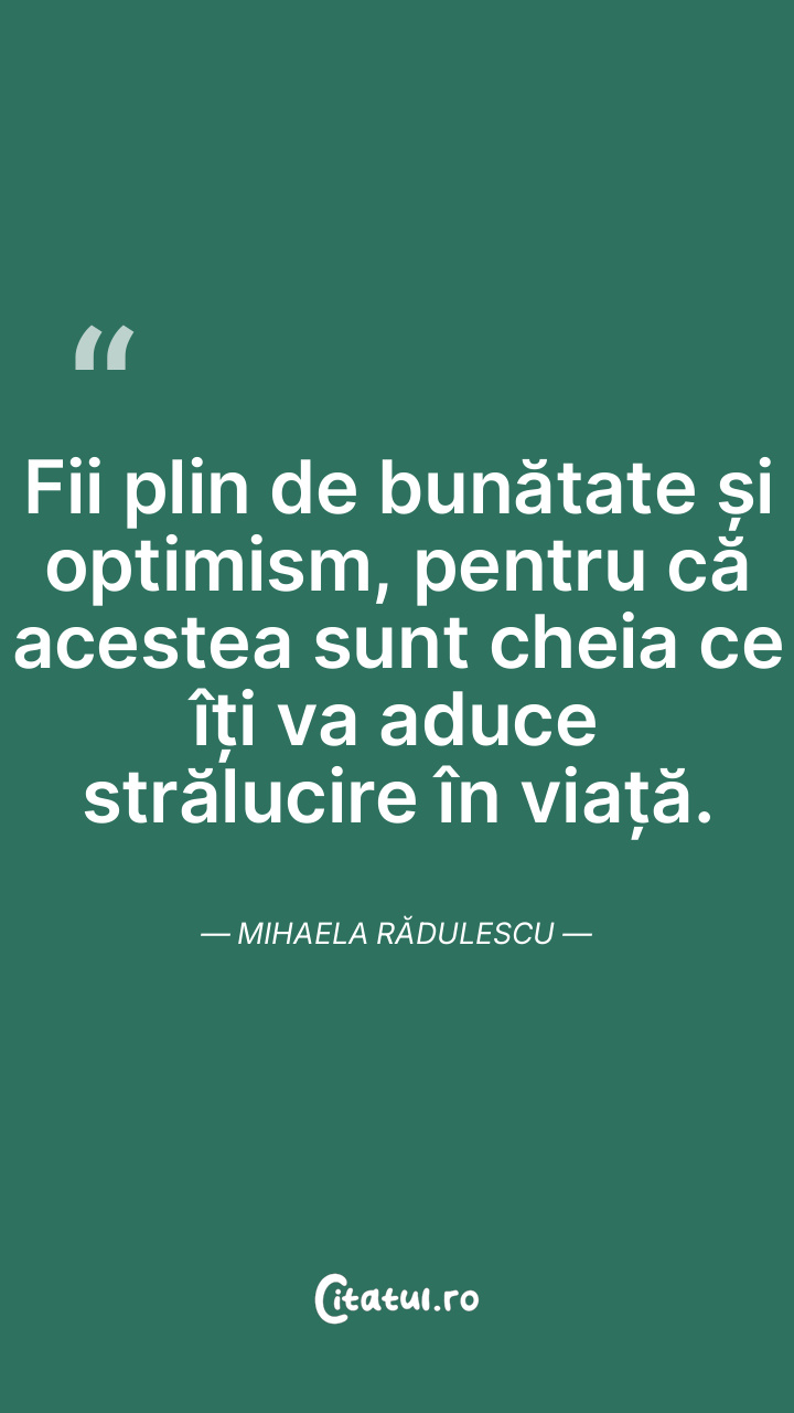 Fii plin de bunătate și optimism, pentru că acestea sunt cheia ce îți va aduce strălucire în viață. Mihaela Rădulescu
