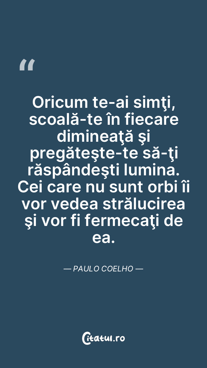 Oricum te-ai simţi, scoală-te în fiecare dimineaţă şi pregăteşte-te să-ţi răspândeşti lumina. Cei care nu sunt orbi îi vor vedea strălucirea şi vor fi fermecaţi de ea. Paulo Coelho