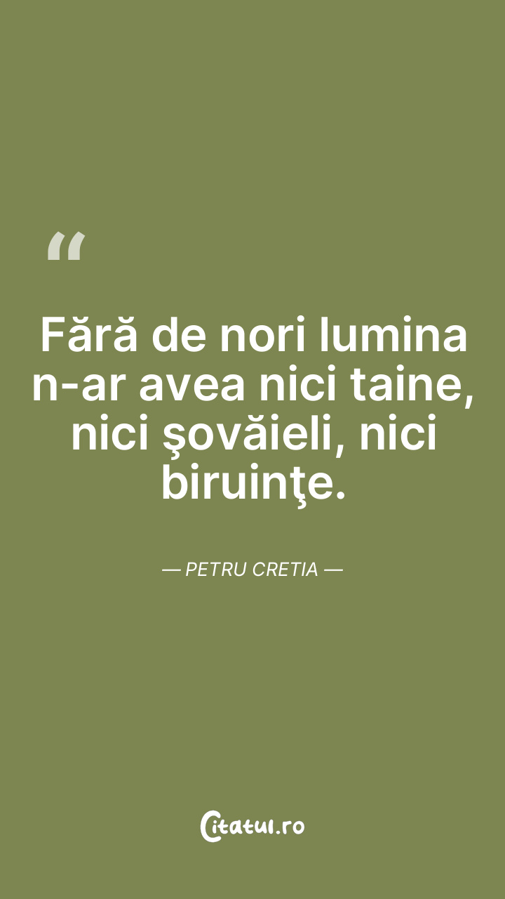 Fără de nori lumina n-ar avea nici taine, nici şovăieli, nici biruinţe. Petru Cretia