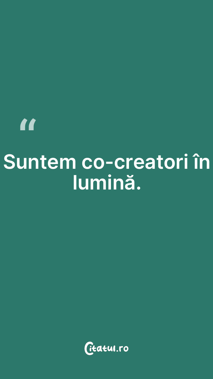 Suntem co-creatori în lumină. ... Categorie: citate spiritualitate Dificultate: Foarte ușor de citit! Votează: ★ ★ ★ ★ ★ (0/5 din 0) Distribuiți acest citat? Alegeți platforma preferată: Salvează citatul in telefon/pc Suntem co-creatori în lumină. Copiază Favorite Eroare