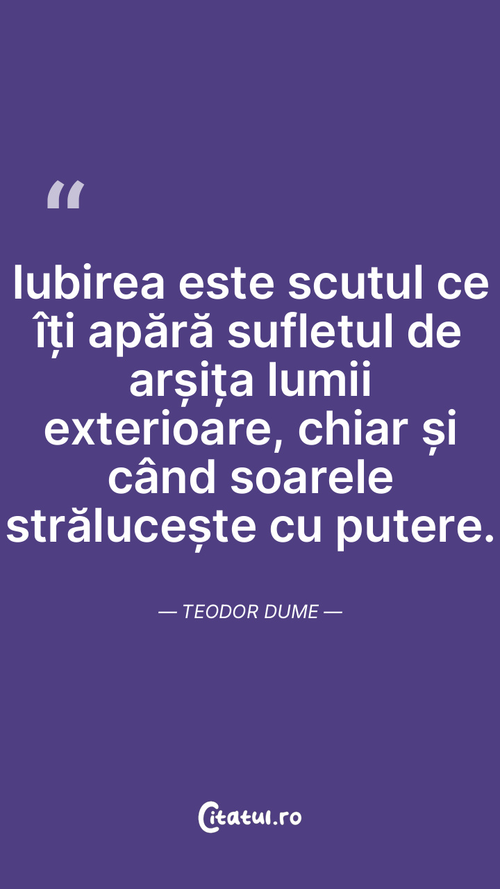 Iubirea este scutul ce îți apără sufletul de arșița lumii exterioare, chiar și când soarele strălucește cu putere. Teodor Dume