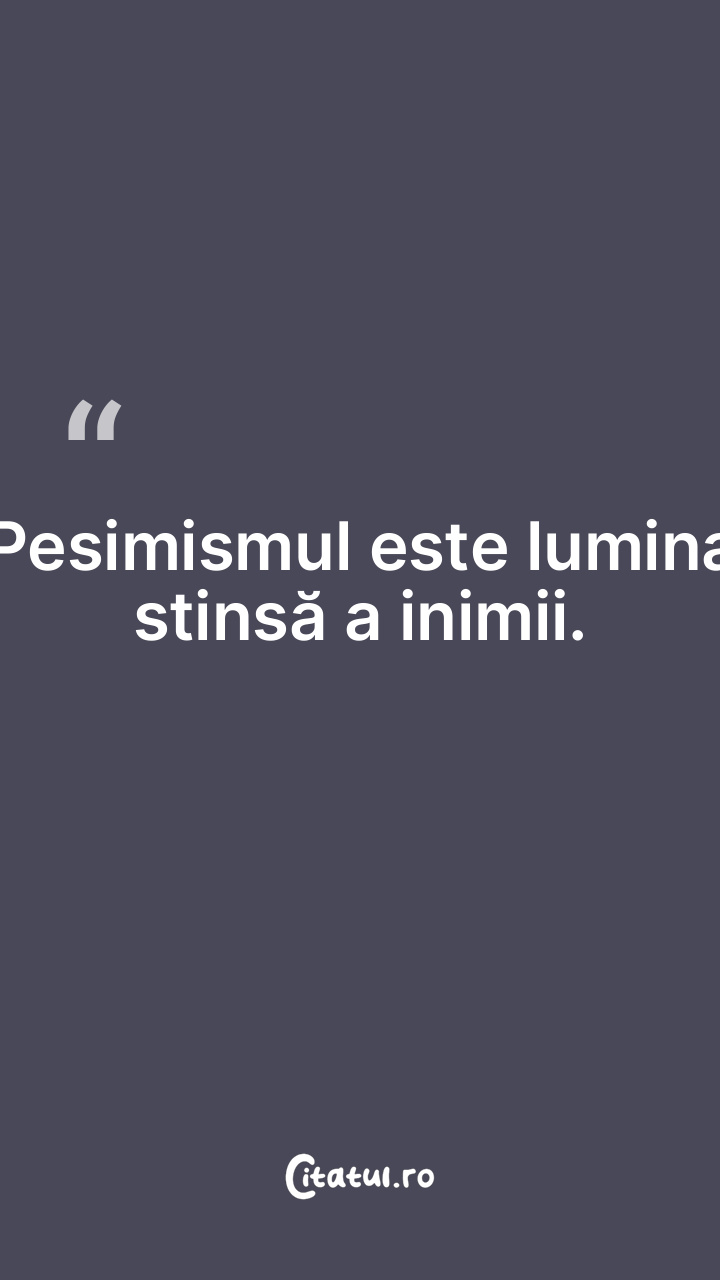 Pesimismul este lumina stinsă a inimii. ... Categorie: citate spiritualitate Dificultate: Foarte ușor de citit! Votează: ★ ★ ★ ★ ★ (0/5 din 0) Distribuiți acest citat? Alegeți platforma preferată: Salvează citatul in telefon/pc Pesimismul este lumina stinsă a inimii. Copiază Favorite Eroare