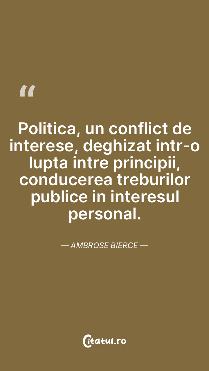 Politica, un conflict de interese, deghizat intr-o lupta intre principii, conducerea treburilor publice in interesul personal. Ambrose Bierce