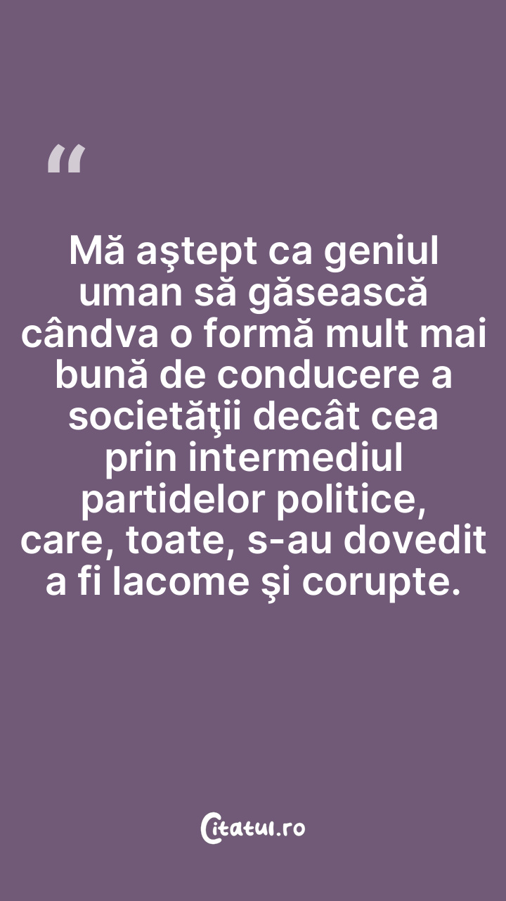 Mă aştept ca geniul uman să găsească cândva o formă mult mai bună de conducere a societăţii decât cea prin intermediul partidelor politice, care, toate, s-au dovedit a fi lacome şi corupte.