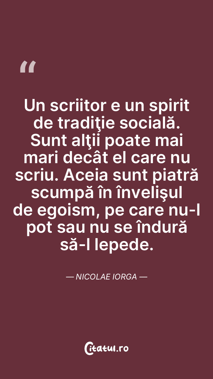 Un scriitor e un spirit de tradiţie socială. Sunt alţii poate mai mari decât el care nu scriu. Aceia sunt piatră scumpă în învelişul de egoism, pe care nu-l pot sau nu se îndură să-l lepede. Nicolae Iorga