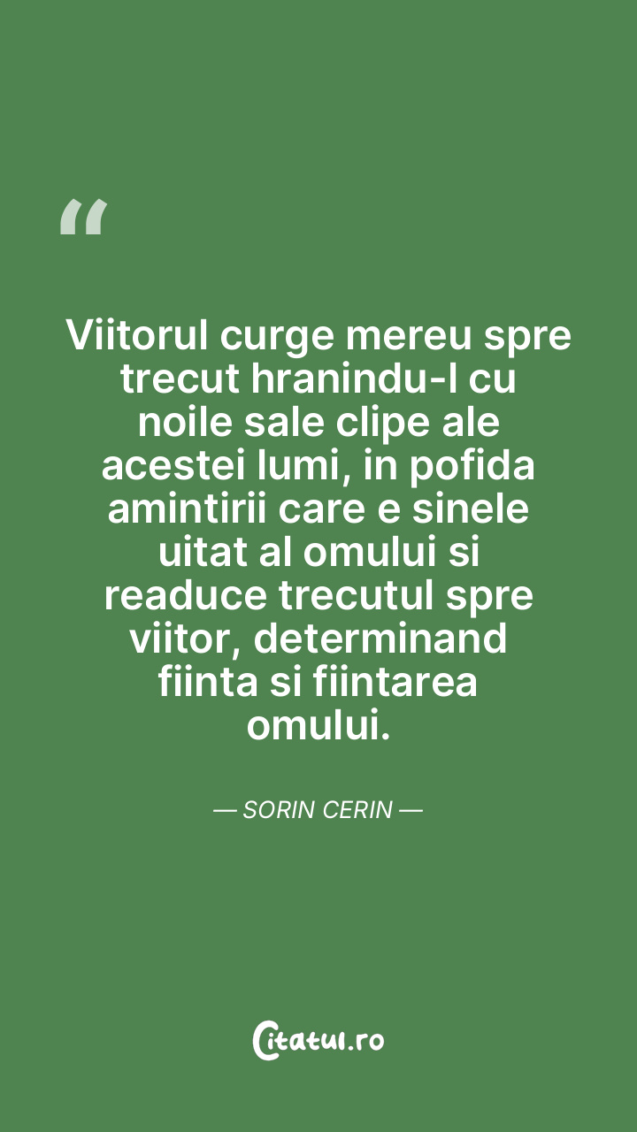 Viitorul curge mereu spre trecut hranindu-l cu noile sale clipe ale acestei lumi, in pofida amintirii care e sinele uitat al omului si readuce trecutul spre viitor, determinand fiinta si fiintarea omului. Sorin Cerin