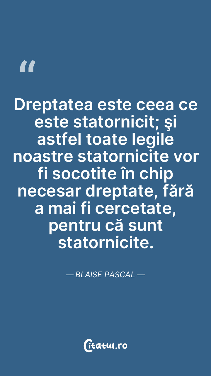 Dreptatea este ceea ce este statornicit; şi astfel toate legile noastre statornicite vor fi socotite în chip necesar dreptate, fără a mai fi cercetate, pentru că sunt statornicite. Blaise Pascal