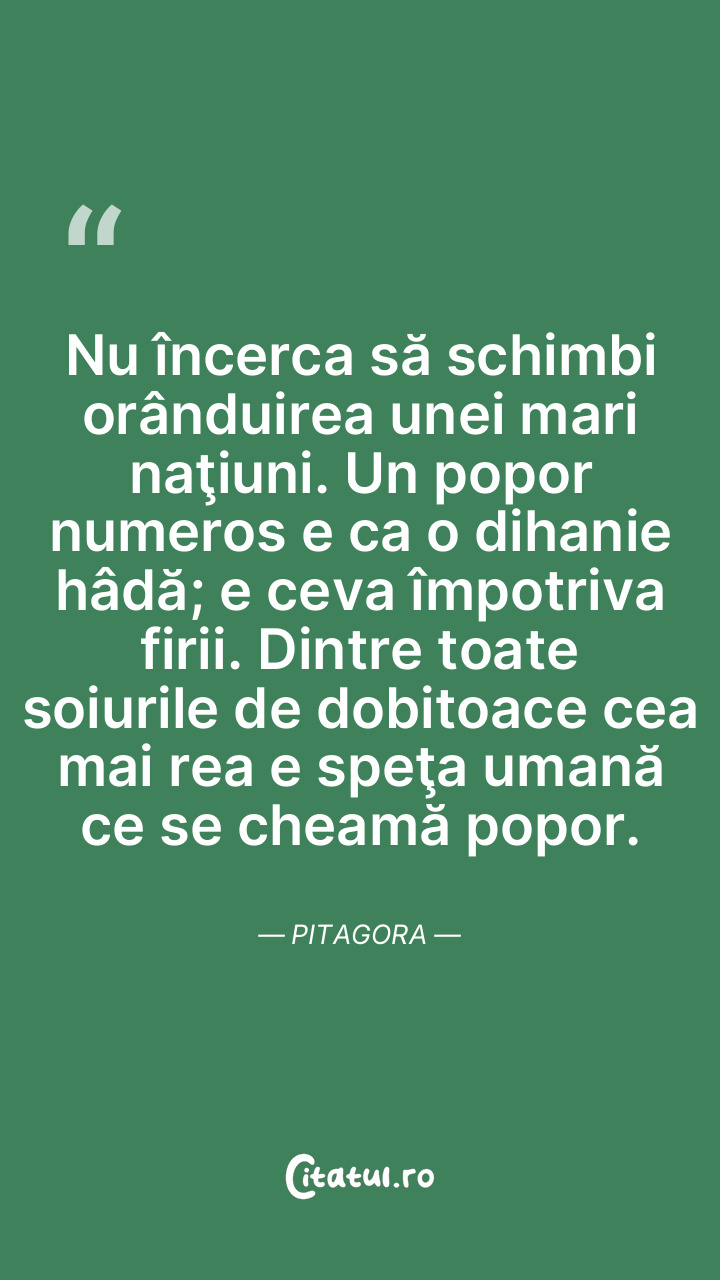 Nu încerca să schimbi orânduirea unei mari naţiuni. Un popor numeros e ca o dihanie hâdă; e ceva împotriva firii. Dintre toate soiurile de dobitoace cea mai rea e speţa umană ce se cheamă popor. Pitagora