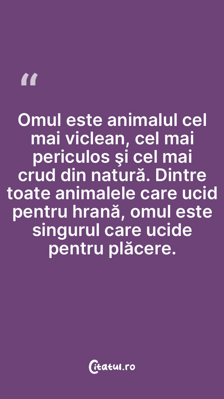 Omul este animalul cel mai viclean, cel mai periculos şi cel mai crud din natură. Dintre toate animalele care ucid pentru hrană, omul este singurul care ucide pentru plăcere.