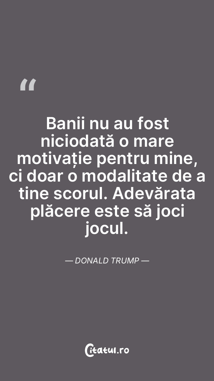 Banii nu au fost niciodată o mare motivație pentru mine, ci doar o modalitate de a tine scorul. Adevărata plăcere este să joci jocul. Donald Trump