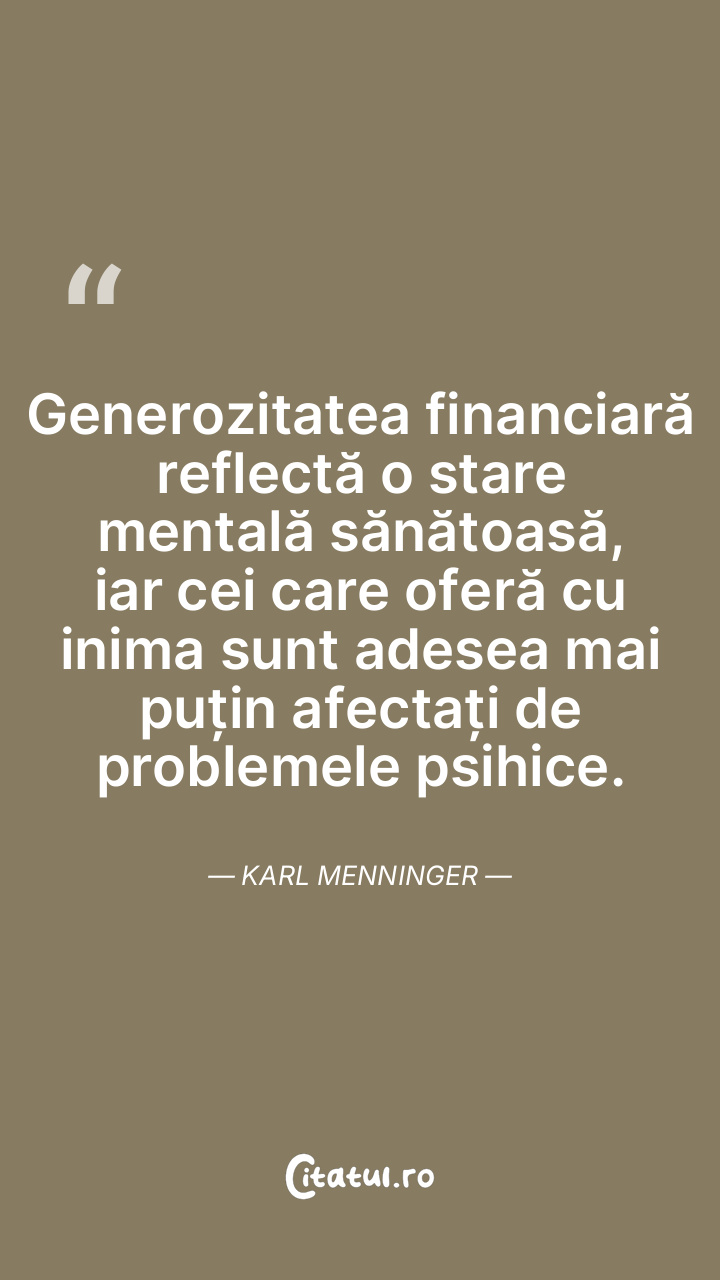 Generozitatea financiară reflectă o stare mentală sănătoasă, iar cei care oferă cu inima sunt adesea mai puțin afectați de problemele psihice. Karl Menninger